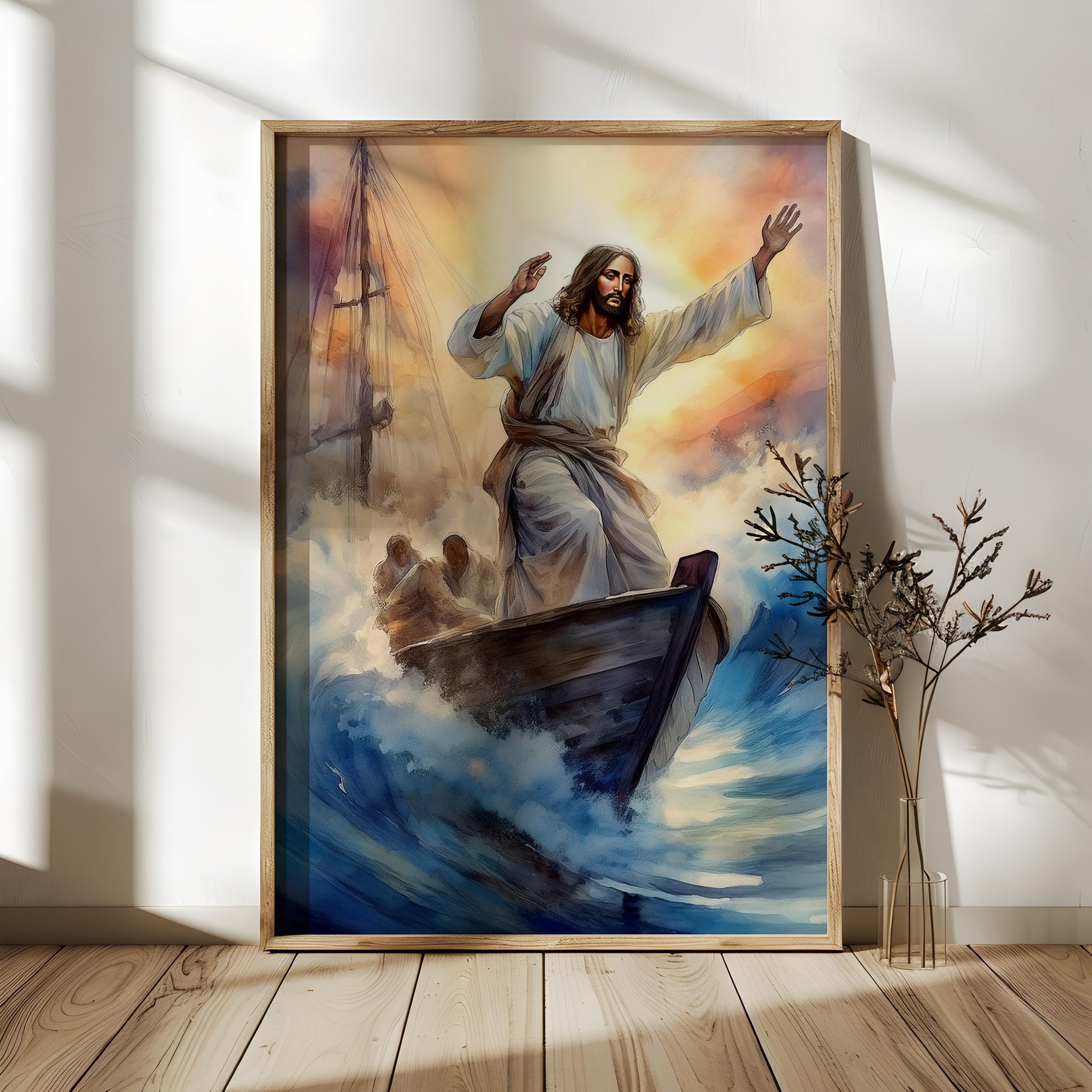 This artwork beautifully depicts the powerful moment of Jesus standing on a fisherman's boat, commanding the wind and waves to be still, showcasing His divine authority over nature. Set against a backdrop of a turbulent sea and dark, stormy skies, the image captures Jesus in a serene, authoritative stance. His arms are raised, and His figure glows with a divine light, cutting through the chaos surrounding Him. The flowing white robe, paired with the dramatic stormy scene, evokes peace, faith, and unwavering trust in God's power.