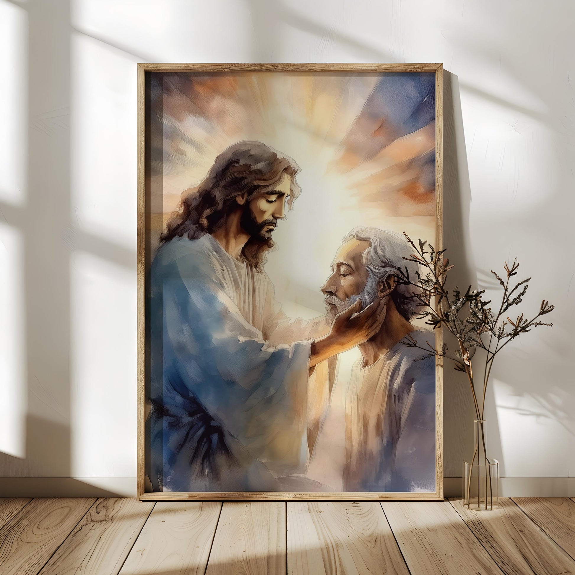 This artwork beautifully portrays the tender moment when Jesus heals a blind man, gently touching his face as light radiates from His hands. The soft, glowing light surrounding the scene symbolizes the divine power of Jesus, illuminating the blind man's world with both physical sight and spiritual insight. The calm, loving expression on Jesus' face reflects His compassion and care for those He heals. The warm, radiant colors bring a sense of peace, faith, and hope to this divine moment of transformation.
